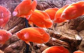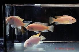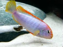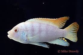 A nearly solid white fish with orange fins and red eyes. Red top albino zebra. Lake malawi mbuna cichlids.