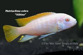 Albino red top zebra cichlid. This albino phenotype of red top zebra still displays some striped to mottled pattering while retaining their yellow red dorsal fin top. Zebra red top albino 5 95 17 95. Flake food low in protein.