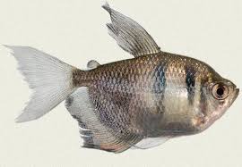 Black tetras of the leucistic aquarium variant. The big anal fin is fan shaped and black in hue. This fish is not to be confused with its cousin gymnocorymbus thayeri which is also called the black tetra.