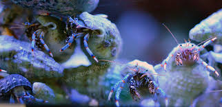 Their legs are colored in brilliant blue orange and black. Hermit crabs are found on sandy areas surrounding reefs rather than moving about on them. They are best housed in tanks with plenty of live rock and a sandy substrate.