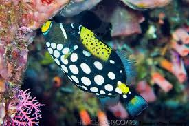 The clown triggerfish have sharp teeth and can bite if they feel threatened by you. The round spots on the lower side of the body and the cigar lips give it the name clown. The clown triggerfish can be recognised by its colouration.