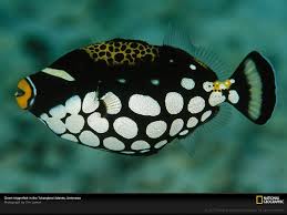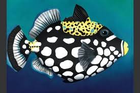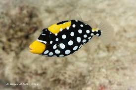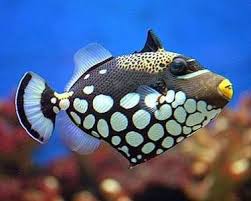 The clown triggerfish or big spotted triggerfish is one of the most spectacular looking marine species. The clown triggerfish is one of the more popular saltwater fish species but you really need the right aquarium set up to keep them long term. It is black with yellow lips.