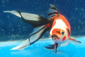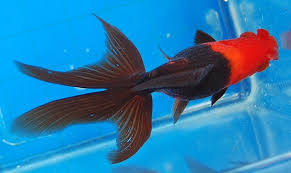 Here is another view note the fins are elongated too. Showa sanshoku are black with red and white markings. Fantail goldfish are egg shaped but with a split tail.