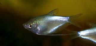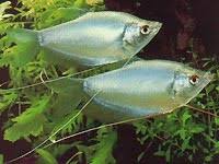 This peaceable engaging species is a well liked aquarium fish. It has a silvery white color with a slight yellowish ans or blueish green hue. The female blue gourami in prime breeding condition will look she ate a golf ball.