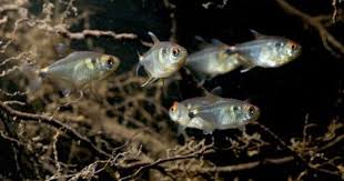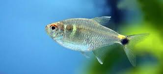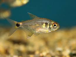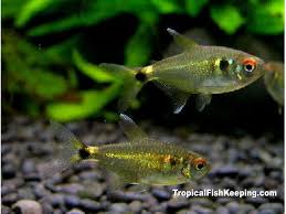 Head and tail light tetras. They have the distinction of being one of the best suited tetras for community tanks and because of their ease of care and peaceful nature they can be found in nearly every store that sells fish. Their body is mostly transparent in color with the head and abdomen having a silver to gold coloration. Head and tail light tetra.