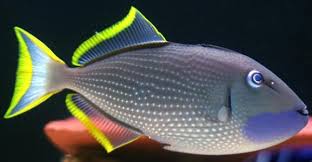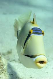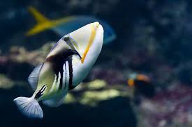 It has a tan body with gradient dark bands and vibrant blue and black stripes on the top of the head with a yellow stripe from cheek to cheek and deeply set back eyes. The hawaiian name for the fish humuhumunukunukuāpuaʻa pronounced. This triggerfish has patterns and colors that are hard to find on any other fish out there.