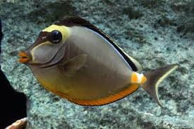 Naso tang. The naso tang naso lituratus also known as the lipstick tang or the orangespine unicornfish due to it s outstanding appearance featuring orange lips and a pair of spines surrounded by a bright orange area on either side of the caudal peduncle with an elongated body shape with a narrow caudal peduncle that distinguish this genus from other acanthurids. As a juvenile the naso tang from hawaii is dark gray with a blue stripe following along the dorsal fin and an orange stripe in the anal fin. These fish both will be 1 5 feet long so the aquarist probably has a 250 gallon 1 135 liter tank on order for them by the time they are both 6 long.