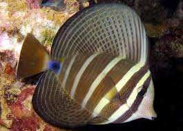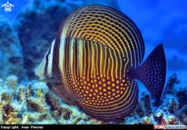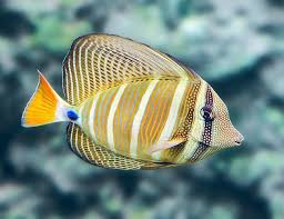 Pacific sailfin tang. This is just one of the exotics that have been photographed while scuba diving over florida reefs. Found singly or in small schools over lower surge zones of lagoons and seaward reefs. The body has five vertical yellow stripes with intricate markings within each stripe.