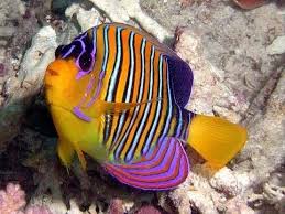 The basic color is yellow to orange with white angled vertical bars trimmed in black and blue which reach into the front part of the dorsal fin while the back of the dorsal fin is solid blue. The regal angelfish or royal angelfish pygoplites diacanthus it is found in tropical indo pacific oceans regal angelfish can grow as long as 25 cm.