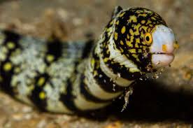 Also known as the fine spot moray this type of eel lives in the pacific ocean and was discovered in 1904. The teeth of this moray are perfect for crustacean prey. In the wild snowflake eels can grow to upwards of 3 feet but in captivity tend to top out at just over 2 feet.
