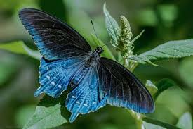 Males feature a silver white body with black vertical stripes across its body up to is head with yellow and blue markings on its forked tail.