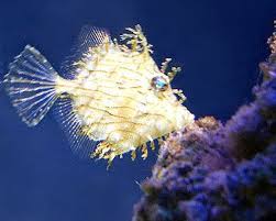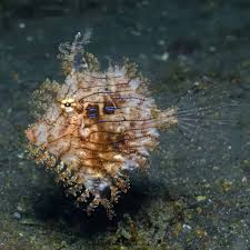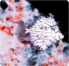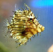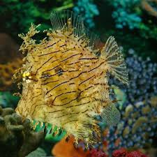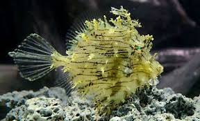 Tassle filefish. It is best suited for a 180 gallon or larger aquarium with weedy areas rocks and at least one suitable shelter. The tassle filefish also known as the leafy filefish or prickly leatherjacket filefish is camouflaged by its light body with dark horizontal stripes. It is best suited for a 180 gallon or larger aquarium with weedy areas rocks and at least one suitable shelter.