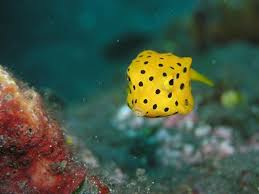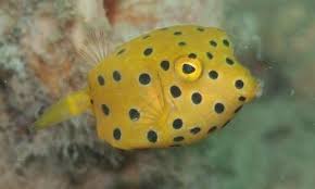 Yellow boxfish ikan kotak kuning. Juveniles have black spots about the size of the pupil.
