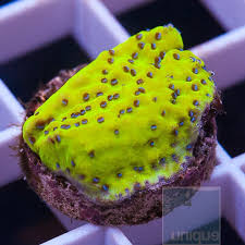 Yellow montipora. Yellow lantana montipora has yellowish green colored tissue interspersed with delicate polyps ranging in coloration from purple to blue. They come in a huge variety of growth forms such as plating encrusting and branching as well as just about every color imaginable. Lets see those yellow rainbow monti s.