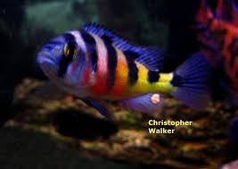 Zebra cichlid. Sesuai dengan namanya warna tubuh pada ikan cichlid yang satu ini adalah merah terang. In local african language this word means rock dwelling or rockfish. It is also fond of lying under an archway of piled stones.